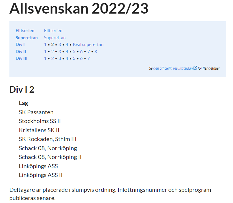 Nu är en preliminär lottning för den kommande allsvenska säsongen tillgänglig. Vi hamnar i en division 1 grupp (2) med nedanstående lag. Resemässigt ser det OK ut med bortamatcher i Östergötland (Norrköping och Linköping) som längst.