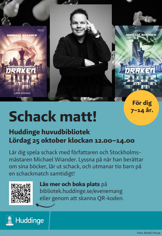 Lördag den 25 oktober, kl 12.00 – 14.00 kommer Michael Wiander, författare till äventyrsböckerna om Schackklubben Draken och övningsbokserien Drakens schackskola (tillsammans med klubbens Robert Danielsson) till Huddinge bibliotek.