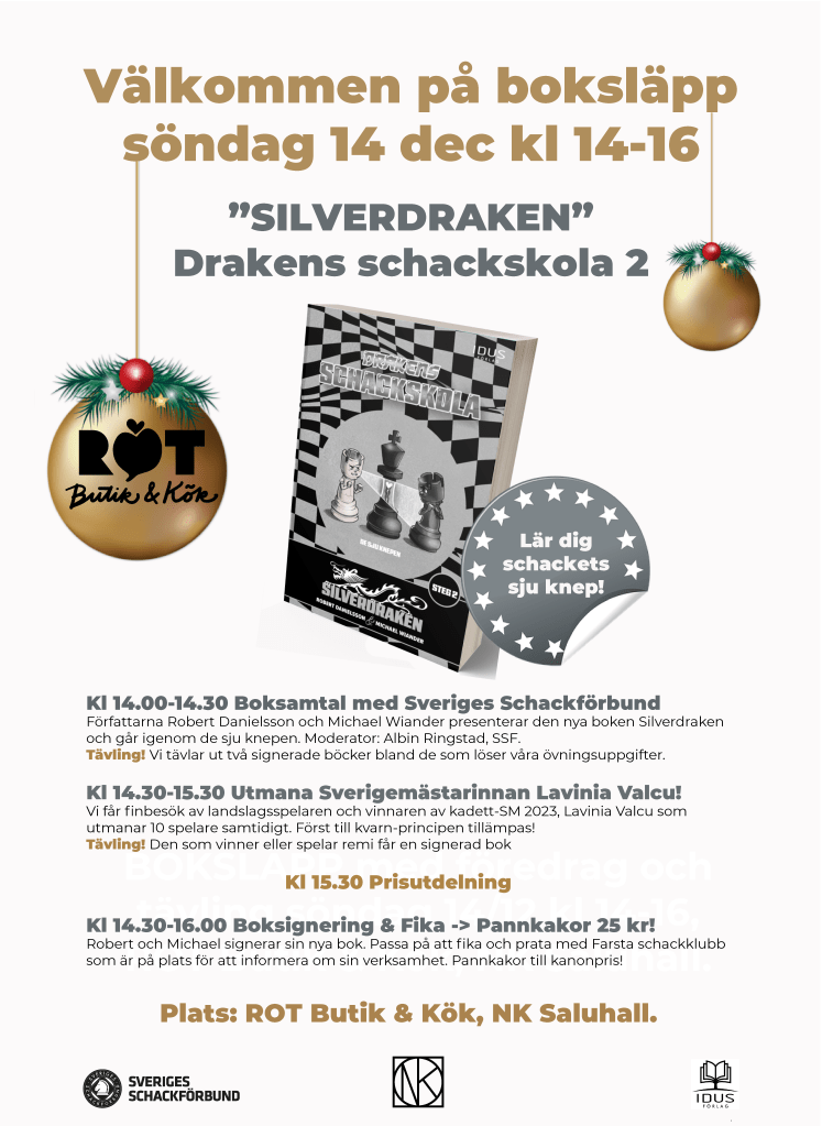 Söndag den 14 december hålls ett event på NK med anledning av en ny bok (Silverdraken) av klubbens egen Robert Danielsson (tillsammans med Michael Wiander som bl a skrivit böckerna om Schackklubben Draken). Den nya boken är en fortsättning på Bronsdraken. Båda är perfekta julklappstips!